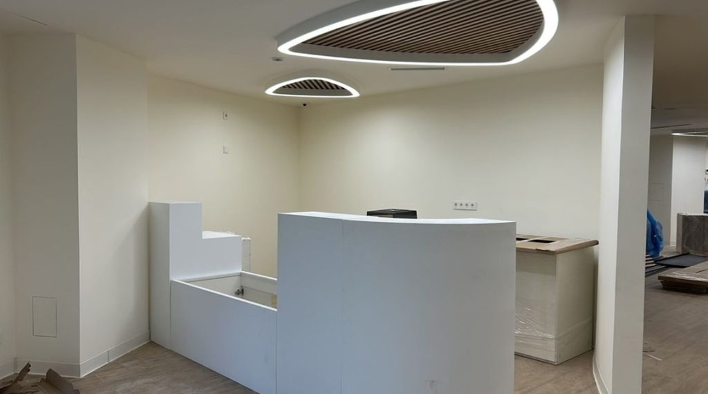 На данный момент специалисты заканчивают ремонт фасадов здания. Большая часть прилегающих территорий уже готова. Рабочее пространство поликлиники полностью реорганизовали. Теперь кабинеты наиболее востребованных специалистов располагаются на первом этаже.