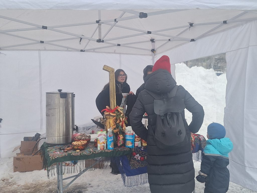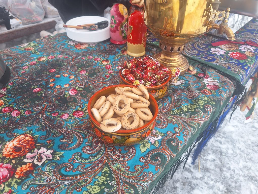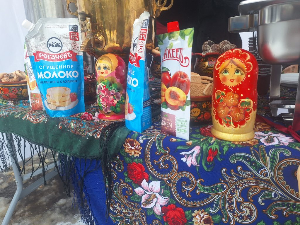 Главным угощением праздника стали блины. Все желающие могли полакомиться ими, запивая горячим ароматным чаем, что помогало согреться во время подвижных игр и хороводов. Для гостей выступали артисты с живым исполнением задорных русских народных песен, под которые многие смогли потанцевать.